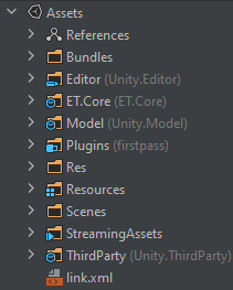 Unity项目中,只需要要包含ET.Core项目(核心,与服务端代码一样),就能使用ET来进行网络请求与通信,Model项目中包含了少量现成提供可复用的组件,自己游戏的代码可以放在Model中,也可以另外创建一个项目引用ET.Core与Model即可。