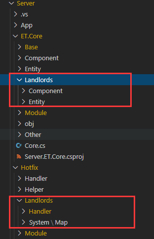 服务端项目中,系统逻辑与Handler都在Hotfix项目中编写,你自己项目的服务端代码主要在这里。后端ET.Core项目中可以加自己游戏的实体,组件,系统类。