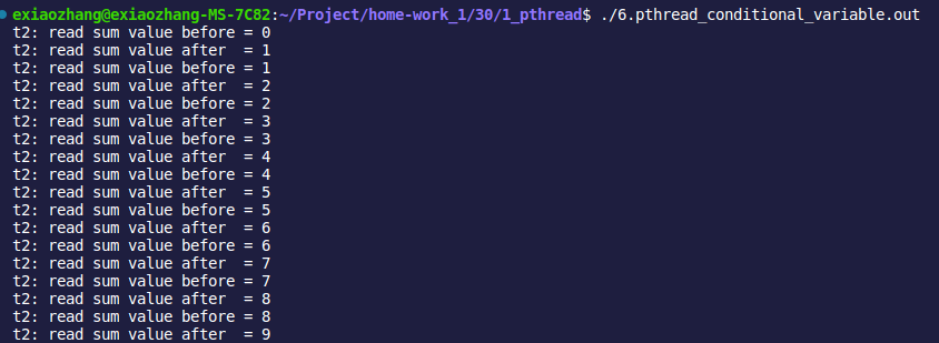 主线程创建的两个线程会对sum_lock交替上锁,不断地打印,循环:sum++,打印,解锁互斥量,执行if语句的操作,当sum=100时,发送一个唤醒命令到一个条件变量队列等待的线程,后者会在sum大于等于100时,随时有可能接收到来自pthread_cond_signal()函数的唤醒信号使得sum=0,并打印执行信息,但无论如何主线程都会在sum与120个1相加(即前两个创建的子线程所执行的循环中i都为60时)终止线程。
