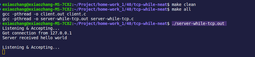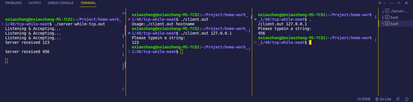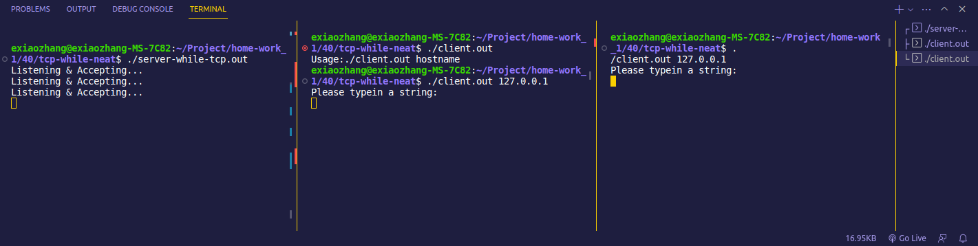 在一个终端运行服务器,另两个运行客户端,查看是否三连接一个客户端还能继续连接其他客户端